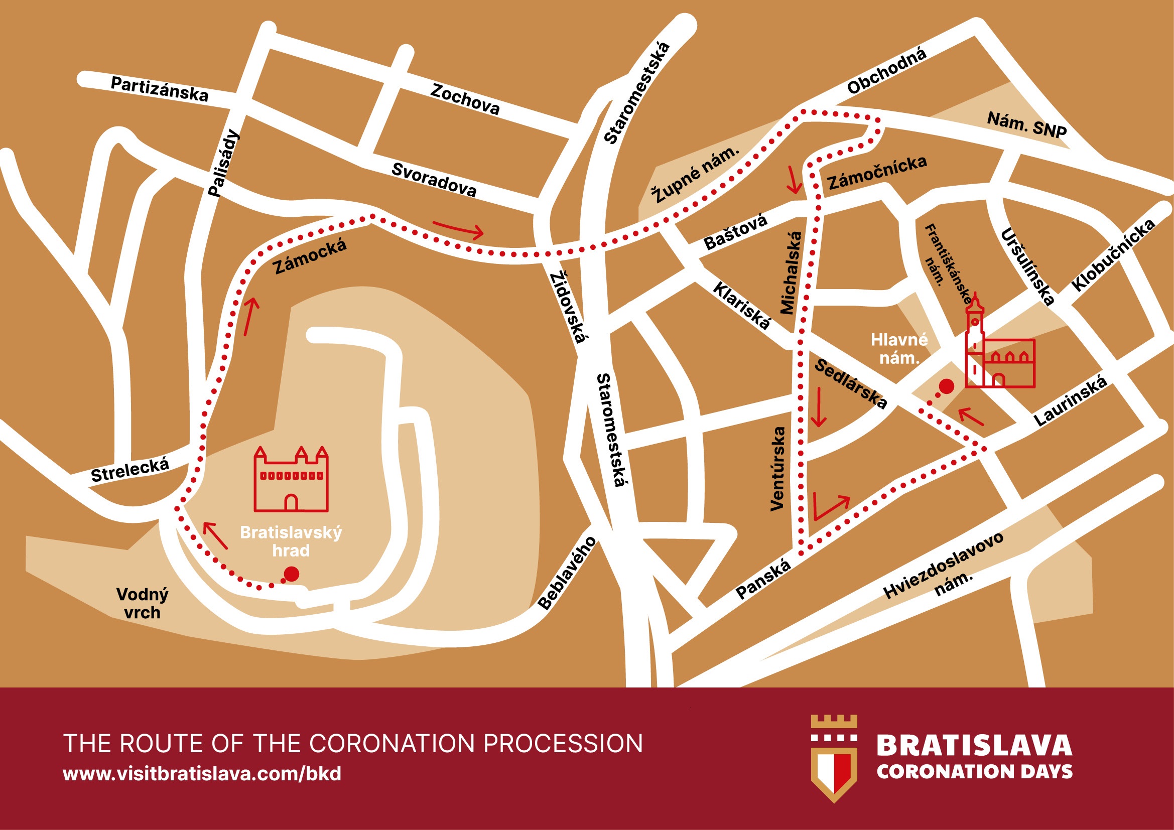 The coronation procession will start parading through the city on Saturday, July 26, at 4 p.m., after group photography (2 p.m.) of historical groups in the sceneries of the castle and a short intro (3:30 p.m.). It will start on its journey from Bratislava Castle to the Main Square, where it will arrive at approximately 5 p.m. Another enticing program will follow in the form of a coronation act, theatrical and fencing performances.