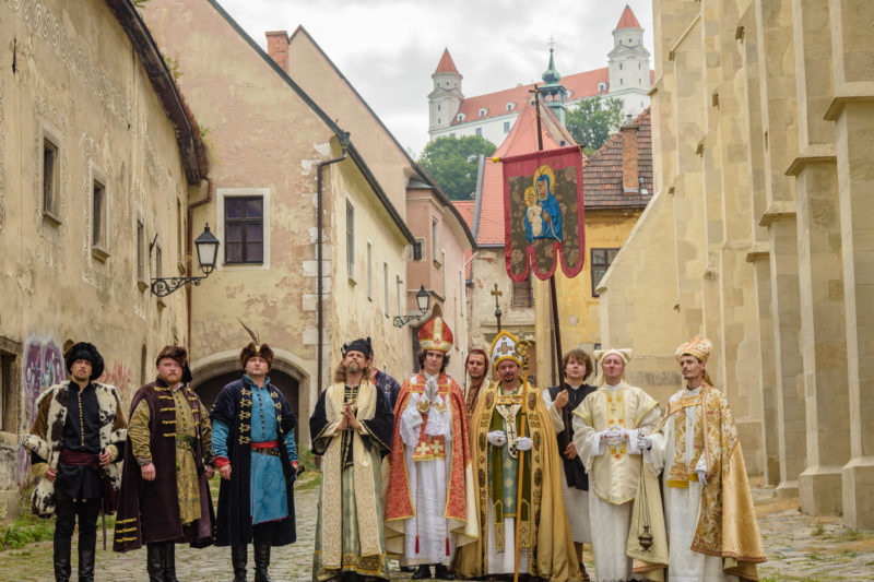 They would then leave the medieval town through Michael’s Gate and across a stone bridge over the moat to stop at an open area outside the city walls, where a wooden stage had been set up covered with red or tri-color drapery. It was on this stage that yet another important event celebrating the coronation took place, where the new ruler would take a solemn oath. The king would repeat aloud the oath to the Archbishop of Esztergom. He would then commit himself to preserving rights and privileges, the integrity of the land and to eventually acquire new territory or free the parts of the kingdom that were currently under occupation. After taking the oath, the new king would be greeted with shouts of joy from the people present. The Palatine would again cry out three times “Vivat Rex!” and the crowd would repeat it. The place was long called Schwurplatz (Square of the Oath or Námestie Prísahy in Slovak), but now it is the site of SNP Square. It was here at the end of the 17th century that a monastery for the Brothers of Mercy was built with a church and a hospital.