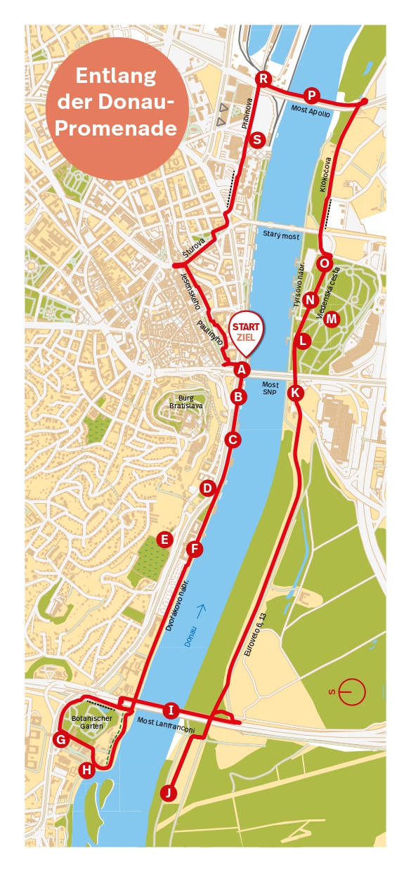 Die majestätische Brücke Most SNP (A) führt Sie aus dem Stadtzentrum, sie ist nicht zu übersehen. Sie fahren entlang der Promenade Richtung Westen. Die Burg Bratislava erhebt sich auf dem Felsen rechts, das Wasser der Donau fließt linkerhand. Stará Vydrica (B) und Zuckermandel (C) weichen bis auf wenige historische Häuser mit Wasserturm einer neuen Ära. An die Geschichte erinnert auf der anderen Seite auch das Mausoleum des bekannten jüdischen Rabbiners Chatam Sofer (D) und der nahezu vergessene Nikolaus-Friedhof (Mikulášsky cintorín) (E). Sie fahren durch den modernen River-Park (F) und den ehemaligen PKO (Kultur- und Erholungspark).