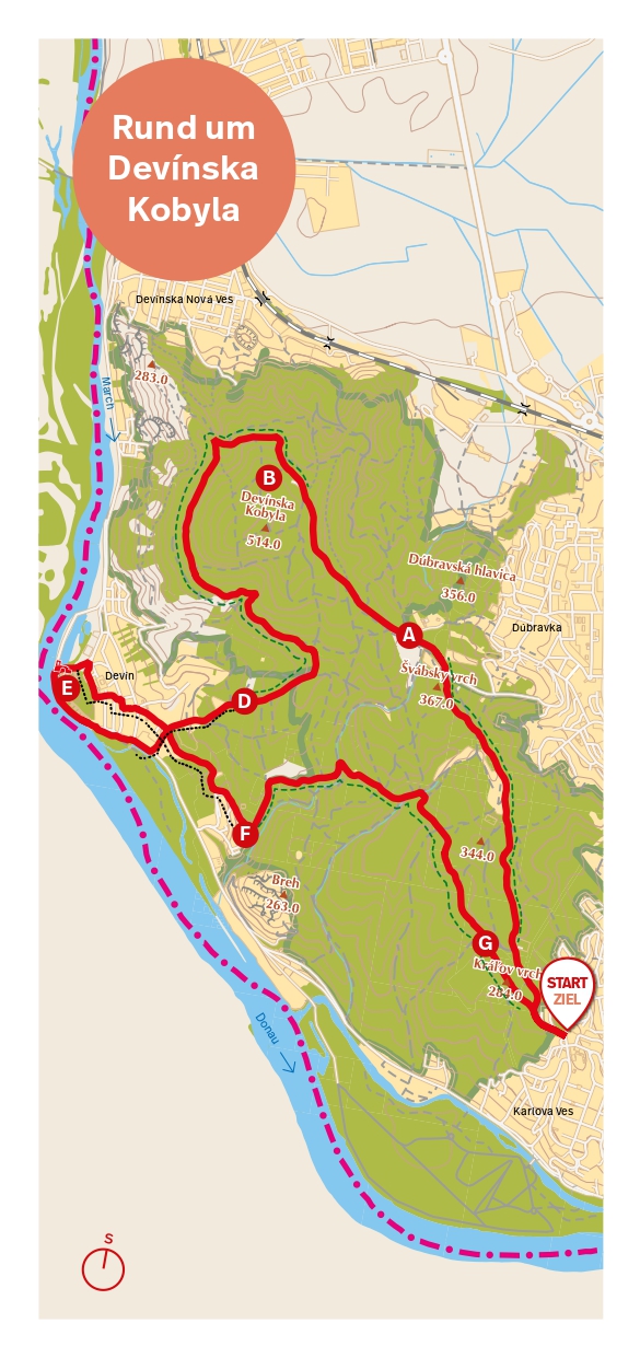 Sie fahren nach Devín durch die Weinberge (D) und das neue Wohngebiet. Wenn Sie sich nach Erfrischungen oder Geschichte sehnen, fahren Sie bis zur Burg Devín (E), wo Sie all dies finden. Hinter den Gärten der Siedlung Gronáre (F) erklimmen Sie wieder die Karpatenwälder. Der letzte Abschnitt der Route führt über steile Anstiege und Täler, aber die Aussicht von der Naturwiese Kráľova hora (G) oberhalb von Dlhé diely ist es wert. Von der Wohnsiedlung Dlhé diely genießen Sie den Abstieg zur Donau, deren Uferpromenade Sie in die Innenstadt führt.
