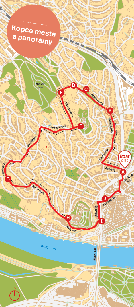 Ak vás láka pozrieť sa na Bratislavu z výšky a nebojíte sa kopcov, táto trasa je pre vás. Len pár uličiek a výškových metrov nad centrom mesta na vás čakajú pokojné štvrte s výhľadmi a množstvom zelene.
