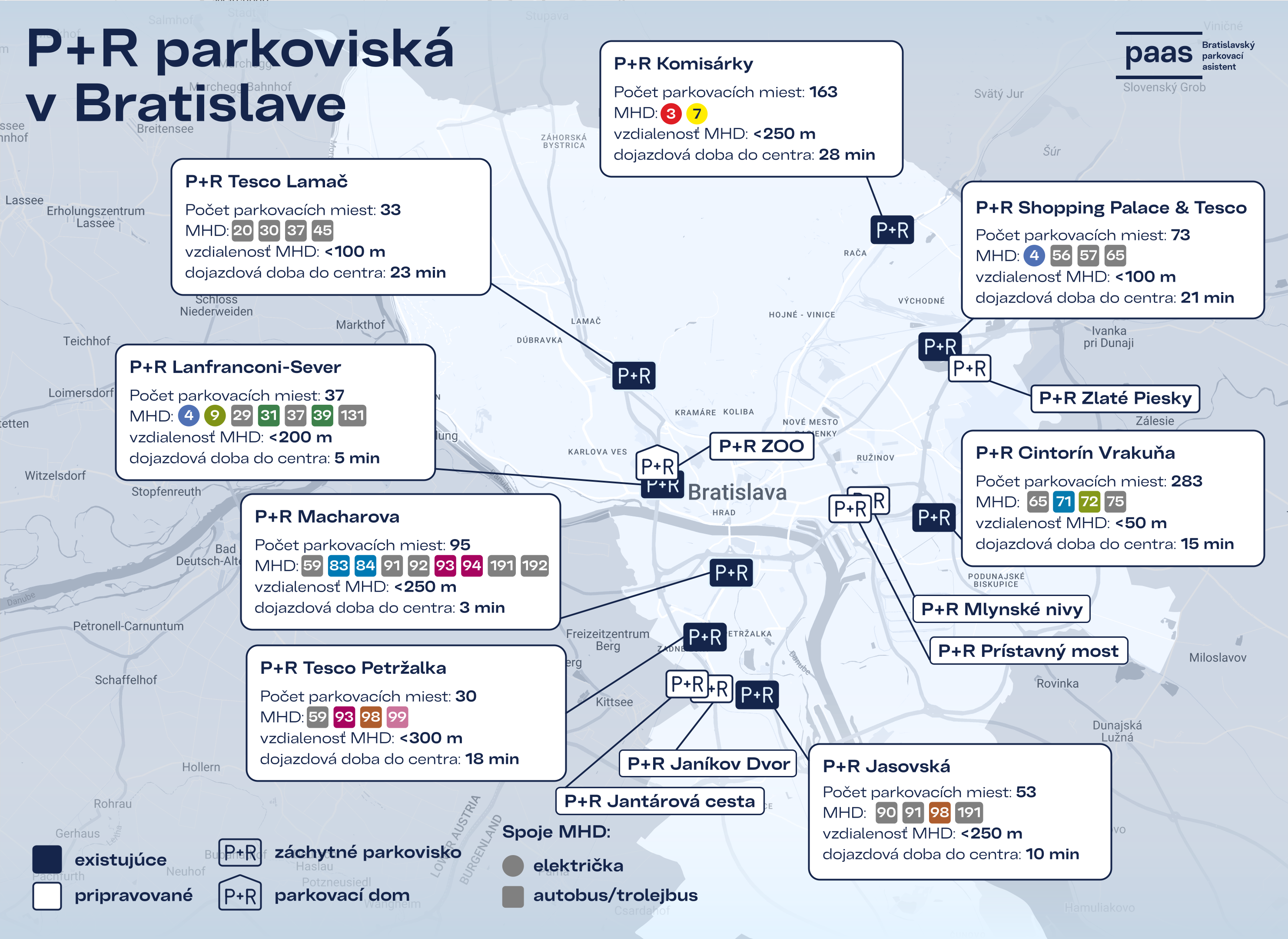 V rámci Bratislavského samosprávneho kraja sú zriadené viaceré P+R parkoviská napríklad pri železničných staniciach v Malackách, Senci, Pezinku, či Svätom Juri. Pre ešte lepšiu dostupnosť sa viaceré záchytné parkoviská nachádzajú aj priamo na území Bratislavy a návštevníci môžu po zaparkovaní prestúpiť na MHD.