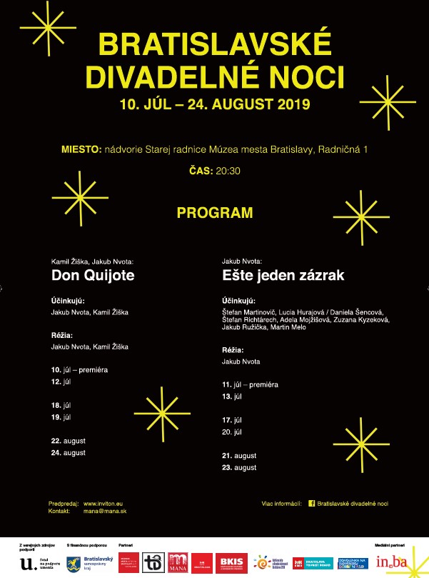Bratislavské divadelné noci po prvýkrát uvedú program už toto leto! Na nádvorí Starej radnice Múzea mesta Bratislavy sa v mesiacoch júl a august uskutoční program, ktorý odštartuje už druhú júlovú stredu a štvrtok premiérami predstavení Don Quijote a Ešte jeden zázrak. Obe inscenácie, obohatené o anglické titulky, vznikajú ako autorské projekty Túlavého divadla v réžii autora Jakuba Nvotu a domácim aj zahraničným divákom ponúknu špecifický pohľad do histórie.