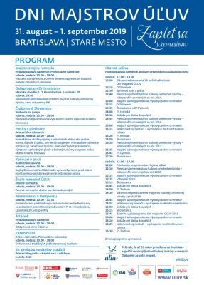 Do uličiek bratislavského Starého Mesta posledný augustový víkend už po dvadsiaty ôsmy raz zavíta najväčší mestský festival ľudovej kultúry a remesiel Dni majstrov ÚĽUV. Tradičné remeslá a domáce výrobky, ktoré sú hlavným festivalovým lákadlom, vám majstri predstavia cez priame ukážky a na chvíľku vás prenesú do bohatej minulosti slovenských remesiel. Dni majstrov ÚĽUV sú veľmi obľúbené aj medzi najmenšími, takže ak sa chystáte do Bratislavy aj s ratolesťami, určite sa oplatí zosúladiť váš výlet práve s týmto podujatím.