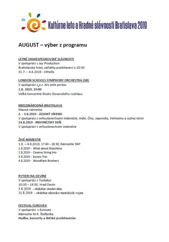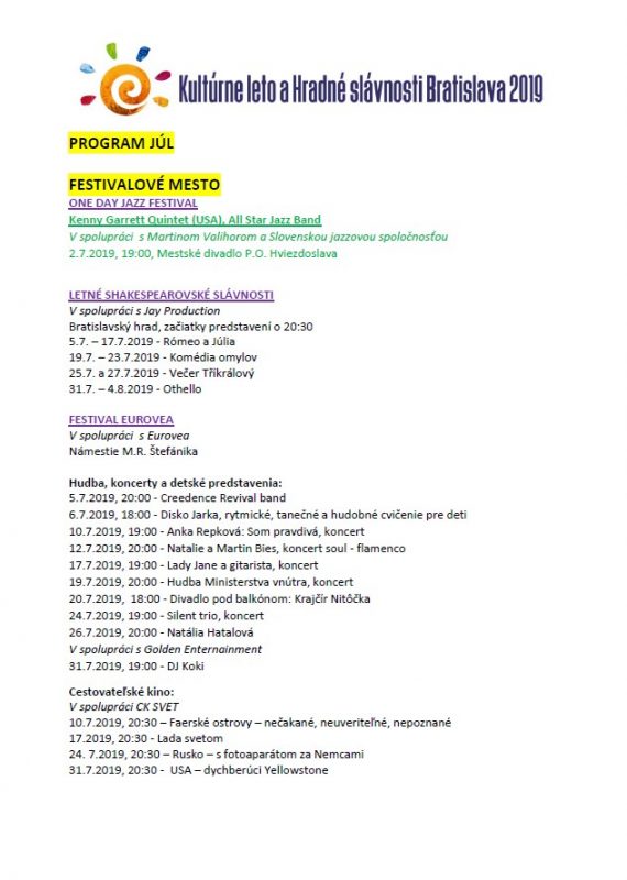 Najväčší mestský festival Kultúrne leto a Hradné slávnosti Bratislava aj v roku 2019 plánuje z Bratislavy vytvoriť scénu plnú multižánrových programov pre obyvateľov, ale aj letných návštevníkov hlavného mesta.